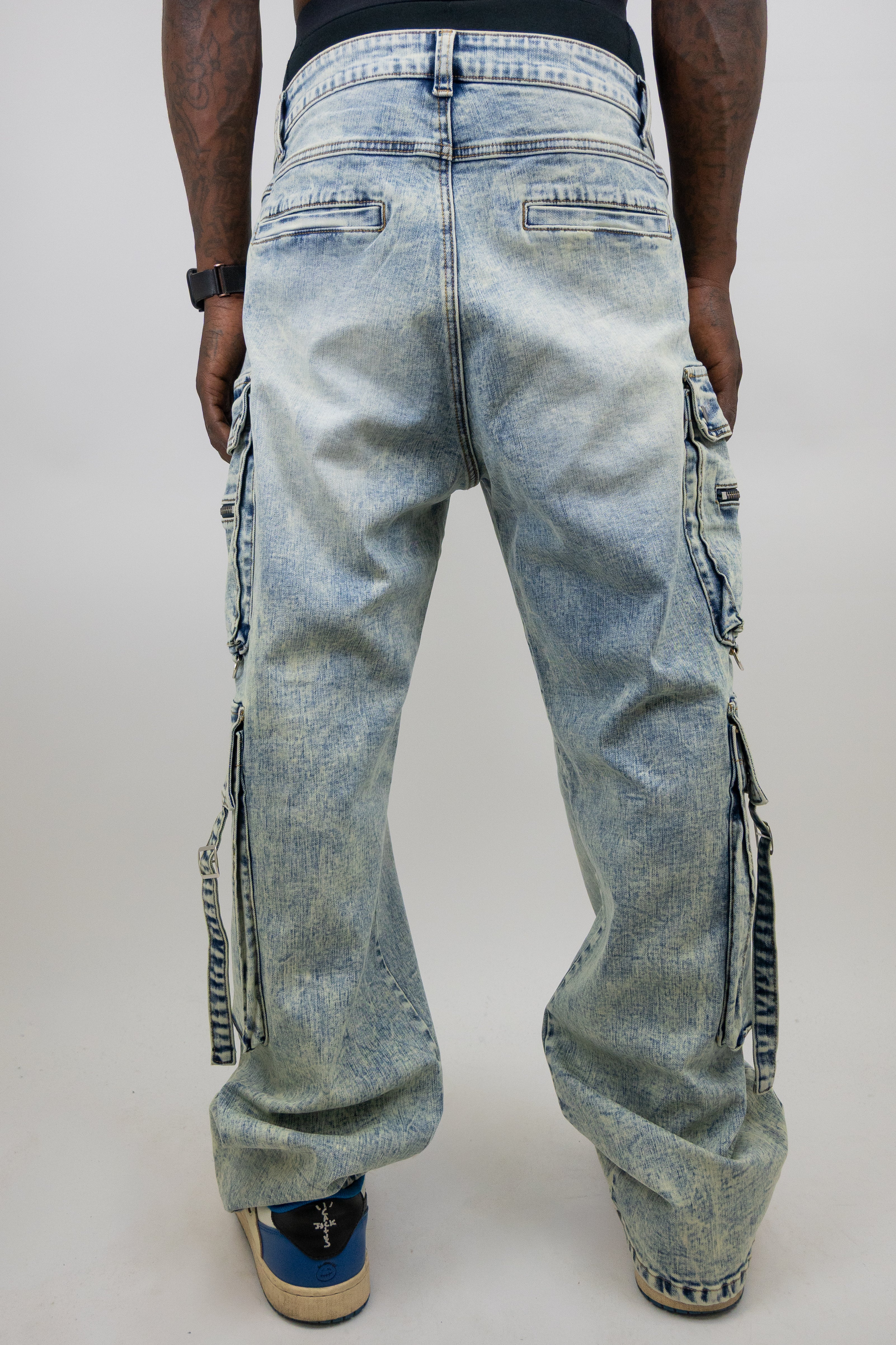 AJ58B Baggy Washed Jeans multi pocket zipper cargos